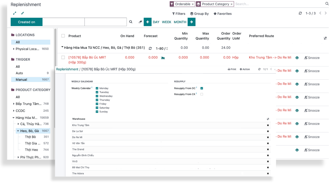 Quản lý quy tắc tái cung ứng cho sản phẩm: tồn kho tối thiểu, tối đa, được cung ứng ngày nào trong tuần, được cung ứng về kho nào.