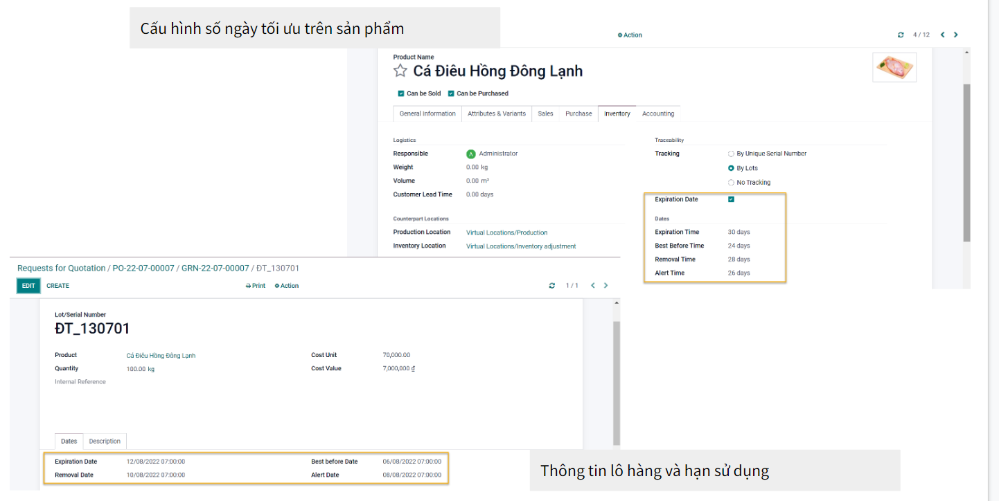 1. Cấu hình số ngày sử dụng tối ưu trên từng sản phẩm. Khi nhập kho, hệ thống sẽ căn cứ vào ngày nhập kho hiện tại và số tối ưu của sản phẩm để tính ra được chính xác hạn sử dụng cho từng lô nhập hàng.