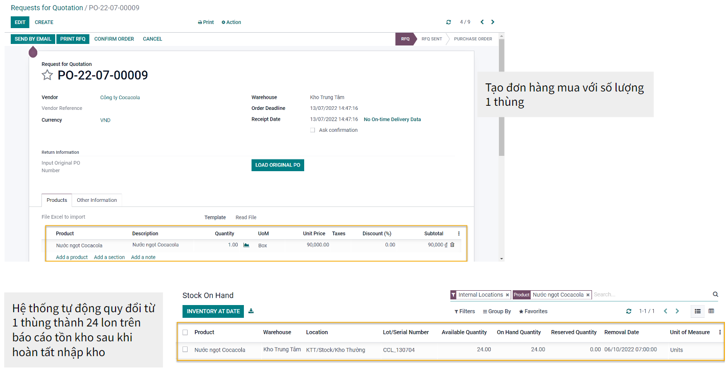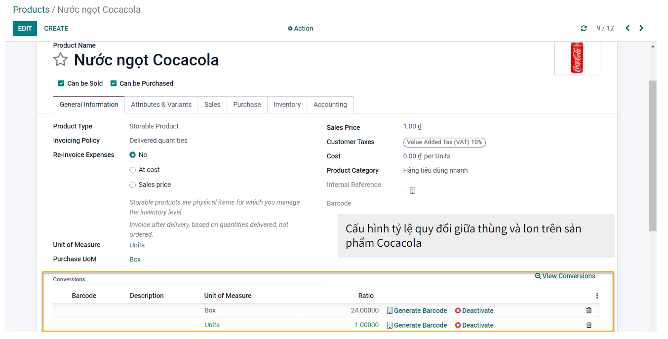 1. Với các mô hình kinh doanh đa dạng như hiện nay thì việc nhập/xuất/tồn theo các đơn vị khác nhau là điều hiển nhiên. Vì vậy, hệ thống Odoo cho phép quy đổi dễ dàng từ đơn vị này sang đơn vị khác dựa theo một tỷ lệ được cấu hình trong sản phẩm.