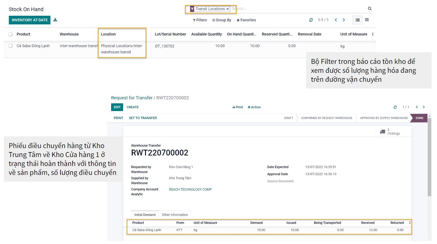 Ngoài ra, hệ thống còn hỗ trợ quản lý được số lượng hàng hóa đang trên đường vận chuyển từ kho xuất đến kho nhận.