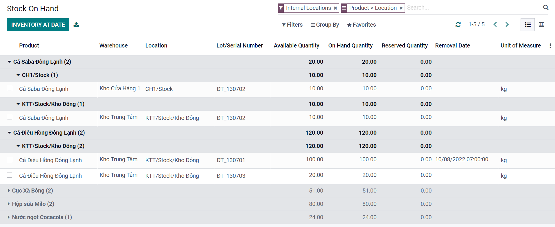 Giao diện báo cáo tồn kho hiện tại được nhóm theo sản phẩm, theo vị trí