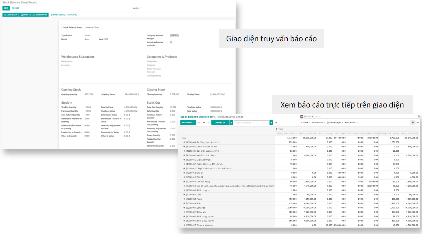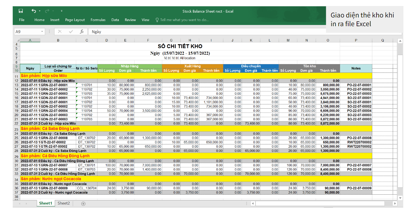 Giao diện thẻ kho trên hệ thống và file Excel