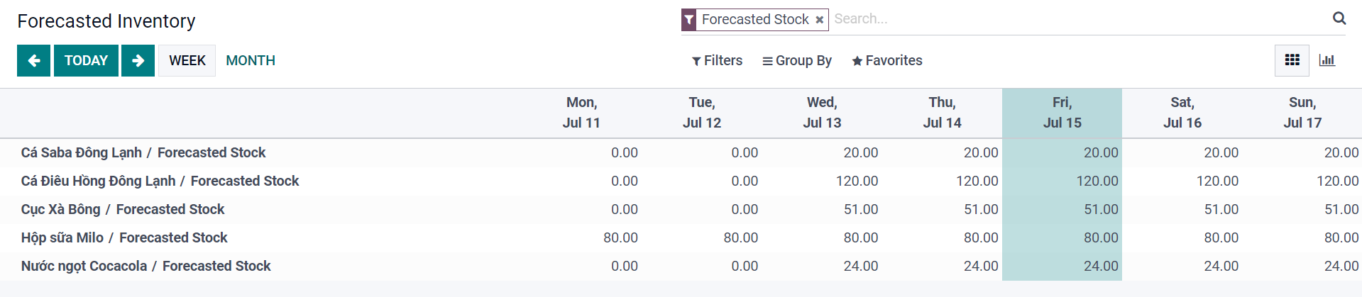 Giao diện báo cáo dự báo số lượng tồn kho của sản phẩm trong tuần