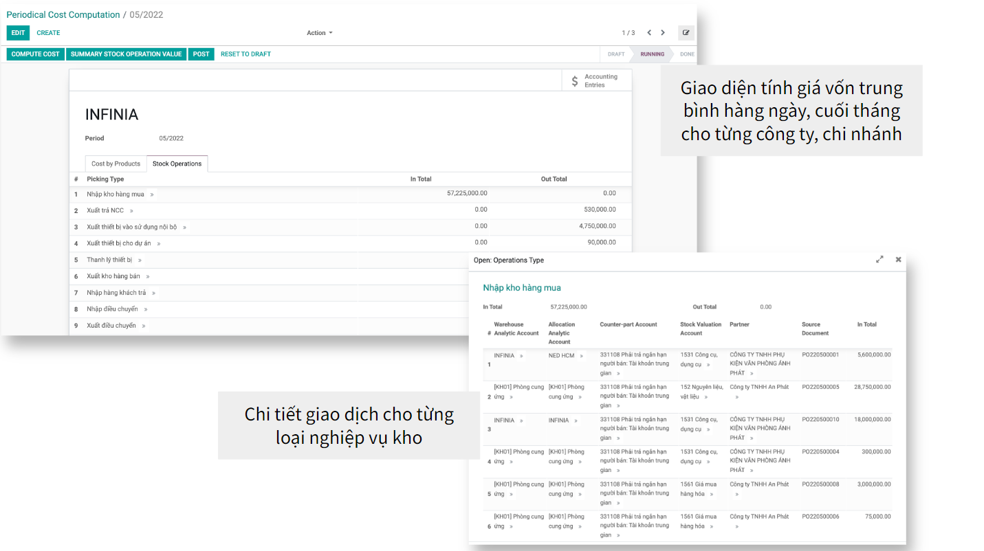 Hệ thống tự động tập hợp các giao dịch nhập, xuất, kho trong kỳ để tính theo phương thức tính giá vốn được cấu hình trên từng nhóm hàng