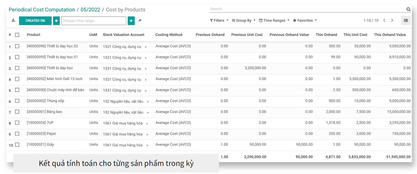 Giá vốn sau khi tính, được cập nhật qua báo cáo xuất nhập tồn và các báo cáo liên quan