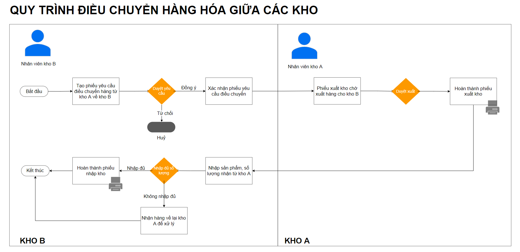 Bên dưới là sơ đồ tối giản trong quy trình điều chuyển hàng hóa giữa hai kho thuộc cùng một công ty.