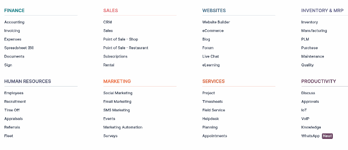 Odoo cung cấp một hệ sinh thái đa đạng các phân hệ hữu ích trong một doanh nghiệp.